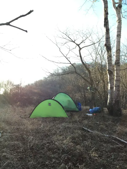 数度の休憩をはさみ、伸びたり縮んだりしながら滝子山、大谷ヶ丸を抜け、ハマイバ丸を通過したあたりで16時頃になった。目標の湯ノ沢峠まで達していなかったが、日没も近いため、大蔵高丸の手前のやや開けた平らな草地でビバークすることになった。ビバーク地からは真っ赤な夕陽が落ちるのがきれいに見えた。