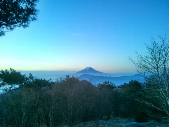 振り返ると白い富士山が見えて絶景だ。山頂は風もなく温かい。1月ともなれば稜線ではラッセルもあり得るはずが、上がってみた尾根は暖冬の影響で雪の片りんも見えず秋山の様子である。昨シーズンから本格的な雪山にデビューした私にとって、今回の山行は雪山を歩く練習の場とも捉えていたため、足元は冬靴、冬用アウターズボン、ザックには12本歯のアイゼンにピッケル、オーバー手袋やその替え、ゴーグルなど、いわゆる雪山装備を携えていたが、それらは全く場違いで出番は皆無、下山までボッカすることとなった。