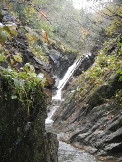 癒し系の渓相の後にいくつか滝が出てくるが困難なものはない。沢幅が狭まったなと思うとV字状の短いゴルジュになる。ゴルジュの出口に滝が見える。記録によればここは登れそうなのだが濡れるのは嫌なのであっさりと右から捲いて通過する。深沢の出合から少しで火打石沢に架かる橋が出てくる。とうの昔に廃道になっているが引馬峠方面へ林道が続いていて今も痕跡は残っている。