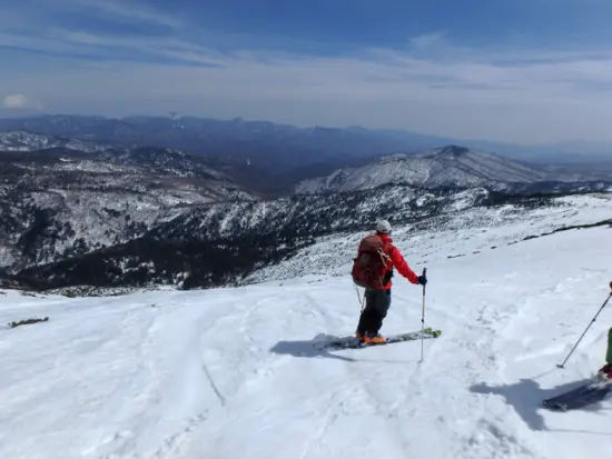 眼下に見える尾瀬ヶ原を目指し、山頂から滑降したいところだが、今年は例年にない寡雪で、山の鼻方面が滑走不可地域に指定されている。また川上川を渡るスノーブリッジがなくなっていて渡渉必至との事前情報により、雪の多く残っている上流側の斜面をトラバース気味に滑り降りて、登ってきた尾根に合流するルートをとることにした。