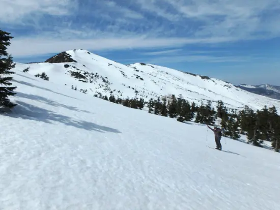 山頂からワル沢に向け200mほど滑降する。そこから悪沢岳方向にトラバース、一旦オヤマ沢田代まで登り返し、今度は尾根上の1,866mPに向けて滑り降りる。斜面は開け、雪は適度にしまっていて快適だ。思わず声が出てしまう。山スキーをしていて一番楽しい瞬間だ。