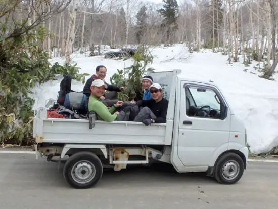 鳩待峠からの下山も大変だー、と皆で話していると、ちょうど軽トラのおじさんが!