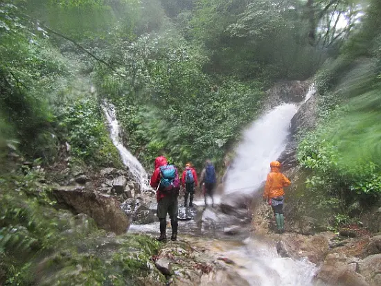 強く降ったり、小雨になったり、止んだりの中遡行をつづける、水量があるので10m以上の滝はロープを出してもらった。