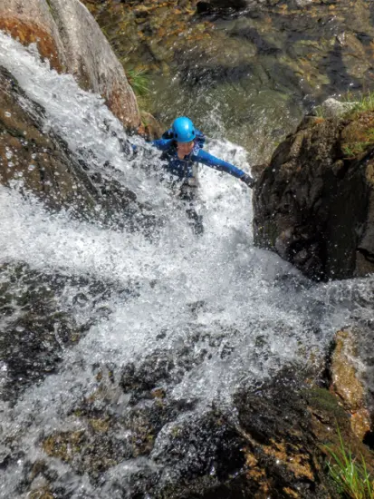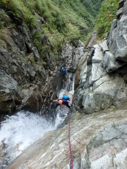 トヨ状の傾斜の緩い15m滝を過ぎるとゴルジュ帯が始まる。滝が連続するものの特に危ないところはなく快適だが、最狭部の直瀑7m滝はロープを出した。ステミングで上がり、ランナーを取ってから右岸に移り滝上まで上がった。