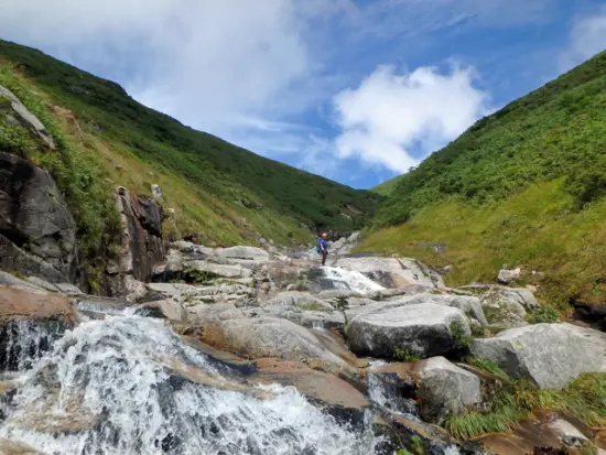 駐車場(6:45) → 出合(7:00) → 奥ノ二俣(13:00) → 登山道(14:20) → 巻機山(14:30~15:20) → 避難小屋(15:40) → 駐車場(18:00)