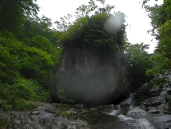 10:30に大滝に到着。右岸のルンゼを高巻いた。さらに進むと20m滑滝の先に大岩が出現。おにぎり型の大きな岩だ。誰かが自分の顔と比較して笑っていた。