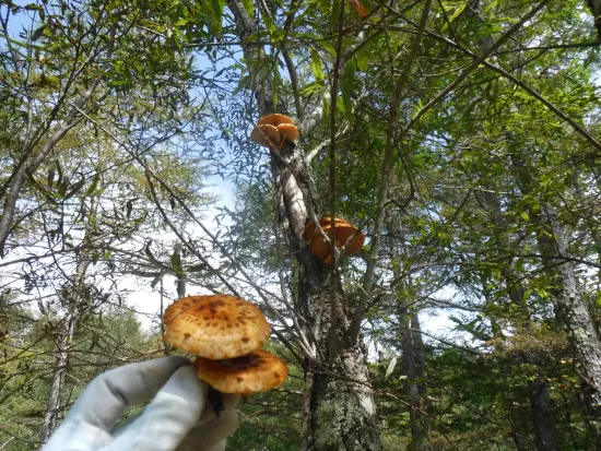 約1時間ほど歩いてヘアピンカーブの先に【金峰山頂】と書かれた指導標が木に掛けられている箇所に到着です。ここが金峰山表参道の取付となります。ここからのんびり防火帯を登っていくと思っていたのですが、この防火帯の斜度が半端ないです!重荷を背負った我々には厳しいです。黙々と登るだけです。20分ぐらい我慢して登れば斜度は緩くなり、尾根から外れて山麓をトラバースするようなルートになります。道形もしっかりついていて最近刈り払いがされた様子です。歩いていていかにも歴史があるようなルートであり、このルートはまさしく古の表参道そのものなのではと思いました。今日は急ぐ必要もなく、今日だけの晴れ間なのでゆっくりゆっくり大地を踏みしめて歩いて行きます。しばらく行くとまた林道に飛び出ます。しばらく林道を進んで行くと真っ平で広い良いサイトにたどり着きました。近くに沢もあるのでおそらくかつてはここは飯場跡ではと思います。ここで幕営してもいいくらいでした。なんとこの辺りの木々にヌメリスギタケが繁茂していたのです。天城さんのキノコチェックでOKが出たのでみんな一斉にキノコ収穫です。誰も採っていないのかとんでもない量をゲットできました。今宵の食卓にのぼることでしょう!この状況をわかっていたのか天城さんは牛乳を持参しておりました。天城さんお得意のホワイトクリームソテーでキノコをこの後頂くことになりました。
