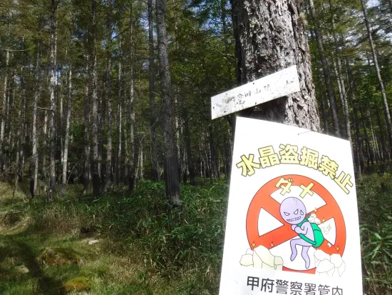 また十字路に戻り、金峰山と書かれた指導標を確認してさらに進みます。水晶盗掘禁止の看板が目印です。しばらくは沢沿いで笹原のしっかりとしたルートをゆっくり登って行きます。