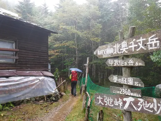 大弛峠には9時半くらいに到着です。塩山駅起点で焼山峠経由のタクシーが停車しておりました。さらに強くなる雨の中、集中山行でなければおそらく躊躇なくタクシーと折衝して乗車して山行を中止していたと思います。しかし集中山行であるので前に進むのです。