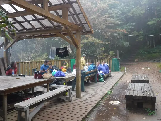 記念撮影をして集中場所である甲武信小屋を目指します。数分で到着するかと思っていたのですが、結構時間がかかり、小屋には10時10分に到着です。事前に皆さんには10時半くらいに来てくださいと連絡していたので、永岡パーティーがすでに到着しておりました。永岡パーティーは昨晩は破風山避難小屋に泊まって暖炉のお陰でかなり暖かかったようです。普通なら小屋前は多くの登山客で大混雑ですが、全く人気がありません。屋根付きのテーブルを占拠できるとは思ってもいませんでした。大田パーティーの到着が遅れていて待っていると雨が降り出してきました。11時過ぎにモートーコールが聞こえてきました。ゆうきさんが一人だけ駆け下ってきました。伝令のような感じで11時に間に合うように一人だけ走って来たようです。数分後に皆さん到着し無事に全4パーティー集中達成です。