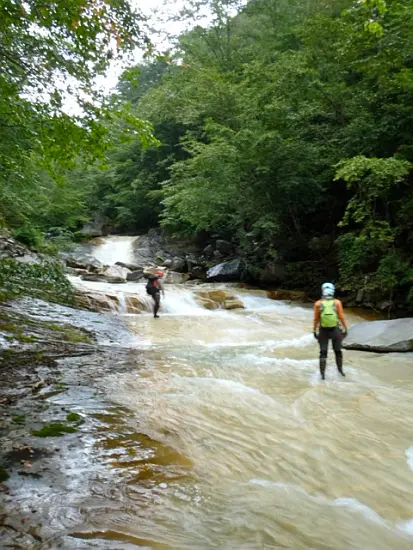 時刻は14時過ぎ。思っていたより時間がかかったので、急いでデポしていた荷物を担ぎ、釜ノ沢出合へ。一日中降っていた雨で昨日通り過ぎたときより、明らかに増水した魚留滝がゴーゴー流れている。左のスラブをにじり上って巻き、癒しのはずの千畳のナメは勢い良くジャージャー流れる中、足をすくわれないよう注意が必要だった。なるべく上に進んでおきたいところだったが、ほどよく雨もしのげそうな平地を左岸に見つけたので15:30、両門の滝手前で幕とした。