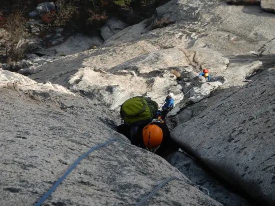 4P目:左側から巨大な板状の岩が張り出し、岩との間にハンドからフィストサイズの岩溝が形成されている。レイバックぎみに10mほど登ると右側からも同様に岩が張り出してきて、左右の岩の板に挟まれた幅50cmほどのチムニー状になる。岩溝にはジャミングを使えるが、溝は岩に向かって左右にあり、体がチムニーにはまった状態なのでなんとも登りにくい。左手は左側の溝、右手は右側の溝、下半身はオフウゥイズスっぽい体勢で登った気がする。 それと、上部が緩やかに左上するので、カムは右側の溝にセットしないとロープがスタックする恐れあり。