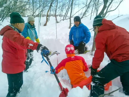今年から山スキーをはじめてみようと初心者講習に参加した。前日、三澤さんのまるみ荘に入り、午前3時過ぎまで宴会、翌朝ゆっくり起きて、机上講習で雪崩のしくみや雪崩の際の対応などを学ぶ。その後、まるみ荘の裏で実践講習。ビーコン捜索、捜索後の掘り出し、半雪洞の作り方、埋没体験、プローブの感触体験を行った。掘り出しは、以前体験したV字型ではなく、最近の推奨は前の人の後ろに並ぶI字型らしく、こちらのほうがエリアが絞れるよう感じがして効率的に思えた。