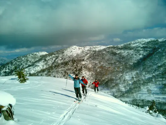2日目は、まるみ荘から10分のたかつえスキー場に入り、ゲレンデでキックターン、横滑りなどの基本技術を練習。新雪エリアを数本滑り、12時頃、頂上からゲレンデと反対側の丸山をめざす。先輩方はすいすい滑っているが、初心者の私には深雪も林の中をやっと歩く感じでなかなか難しい。300mくらい下降しただろうか?今度は板にシールをつけて登る。スキー板は、ツボ足やワカンより安定していて緩斜面ではグイグイすすんだが、急斜面になると逆すべりしてきたりターンができなかったりと難しく何度も転んでしまった。山頂からの景色は素晴らしく、そこから滑る爽快感は、登山とはまた違った気持ち良い感覚だった。ほんの少しの下降だったが、それまでの緊張感と転倒で足がヘロヘロで、ターンの度に転んでしまった。