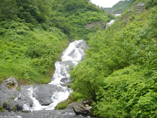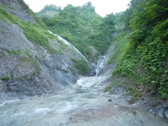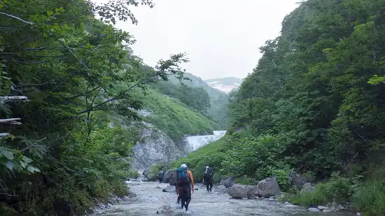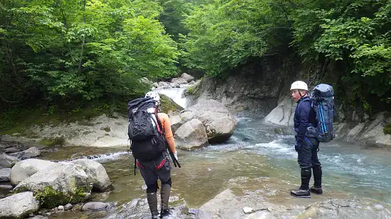 | 【7月15日】 | 中沼登山口発(9:05) → 尿前沢入渓(10:00) → フロ沢出合(10:40) → 三ツ折り滝着(11:55~13:00) → 大滝(14:10~16:20) → 夫婦滝手前の幕場(17:50) |