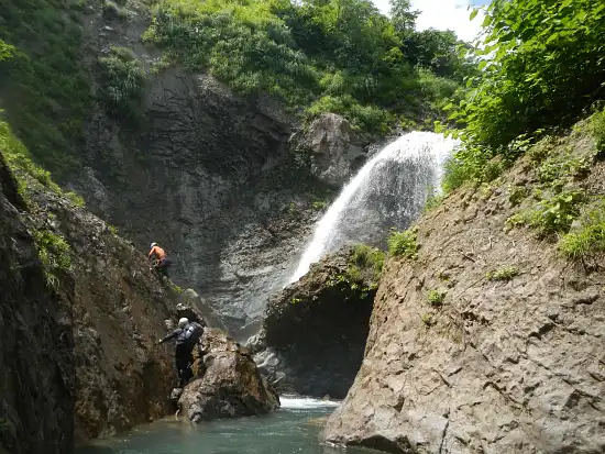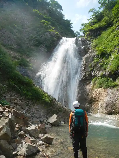 ゴルジュを抜けたところで1本取り、また気を取り直し歩きはじめるとすぐに第二関門の大滝が目の前に現れた。想像通りの迫力だ。