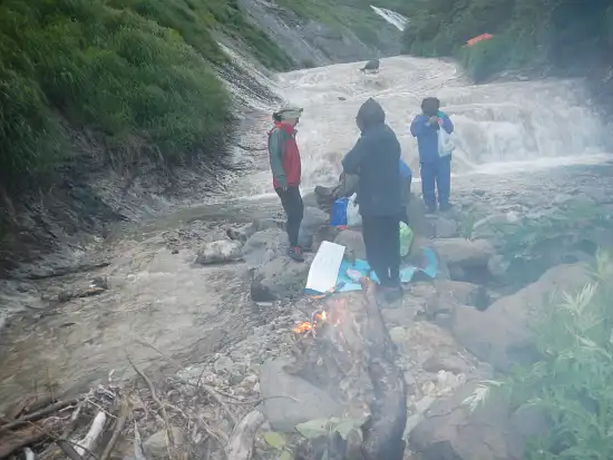 翌朝、天気は下り坂。6時に幕場を出発。すぐに夫婦滝に取りつく。明け方からのシトシト雨ですっかり岩肌は濡れている。記録にある通り、水流の左壁を登るが最初の5mくらいが厳しい。荻原さんがハーケンを1枚打ち、さらにその上にある残置されたハーケンで気休めの支点を取り、左壁にある滝の落ち口から1m下の強固な支点までロープを伸ばす。30mロープでギリギリの距離だった。その後全員登り切るまでに2時間を要した。