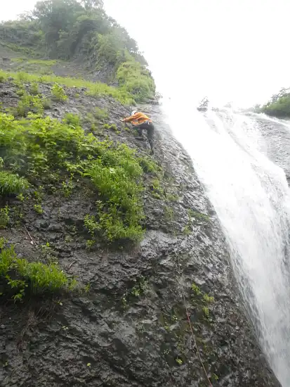 時計は既に14時をまわっていた。ここは右岸のガレ場を登って行く。石を落とさないように気を付けてはいるものの、まぁ見事にガレガレなのでほぼ不可能に近い。「ラーク!」の声がこだまする中、なんとか高度を上げ適当なところでトラバースポイントを探す。荻原さんに「どうする?うっちーリードする?」と聞かれたが自分の実力を鑑みて素直に辞退させて頂いた。そしてここのトラバースでやっぱり素直に50mロープ持って来ればよかったな~と後悔することになった。ロープを繋げたものの結び目が支点を通らず、リードが最終ポイントに到着する前に、2番手が出発し結び目を通さなくてはロープが伸びないというちょっとマヌケな事態に陥ってしまった。反省。全員がトラバースを終えたところで、30mロープを2本繋いで懸垂で滝の落ち口ジャストに降りた。