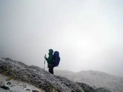 昨夜からの風・雪は止むことなく続いていた。天気予報は3日間晴れると言っていたのにと文句を言いながらの出発。白桧岳近くになると笹原になり強風を直接受ける。視界もほとんどなくわずかな踏み跡とテープを頼りに風に振り回されながら進む。白桧岳山頂は何度も立っているがこれまでと景色が一変。山頂確認ができないまま白根隠山の裸尾根に取り付く。普段は印象の少ない山だが悪天候になると日光白根山同様の雄姿に見える。何度も道を間違えたかと自分を疑う。山頂も近くなると、強風雪の中で立って歩くことができず地面を抱くように歩く。やっとの思いで山頂直下の風の弱そうな笹原で現在位置を確認。少し登り返し山頂の山名板も確認。現状から早く抜け出したかったのでコンパスを南東尾根に合わせ一気に100m程下ったところで休憩。そこは天国のようだった。風もなく青空さえ見える。朝から戦ってきた3時間は一体何だったのか、お互いの指先は軽い凍傷を受けているのに。