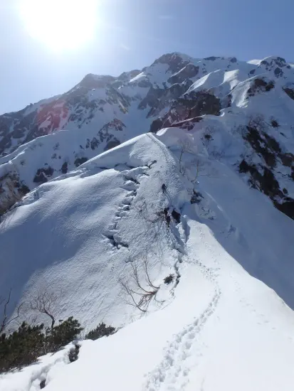 時期や天候によってはラッセルや氷化した雪壁などで苦労するのだろうが、今回はアイゼンの前爪を使うような場所もほとんどなく、雪稜というより雪山歩きという感じでひたすら登っていく。人気のルートだけあってトレースはバッチリ。今日も数パーティが先行しているようだ。日陰がほとんどないうえに快晴無風で汗が噴き出す。