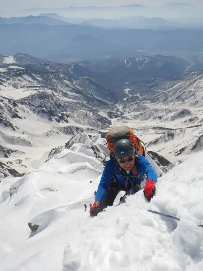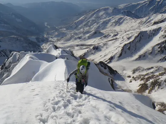 途中の短い雪壁でロープを出していた山スキーヤー2人を追い抜き、頂上直下、約60度の雪壁の前のコルへ出る。ここは少し広くなって安定しているので最後のピッチを登っている先行4人パーティを眺めながら順番待ち。山頂へ突き上げる雪壁は50mロープでは頂上まで足りないので2ピッチに切る必要がある。下の1段はフリーであがり、最後のピッチを西村さんが山頂までリードした。ロープを出したのはここ1箇所だったがトレースが階段状についていたおかげでそれほど難しい登りではなかった。