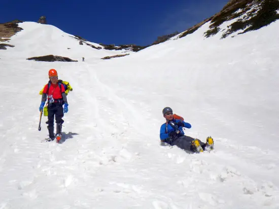 雪解けが進み、何ヶ所か雪の割れている場所があり慎重に歩く。途中テントが2-3張は張れそうな場所もあり、早く休みたいなーという願いを込めて「ここにも幕張れますねぇ!」と言いながら(チラッ)リーダーの様子を伺うが、まだまだ行動終了する気はないようだ。「まだダメ!2峰と3峰の間のコルまでは行く!」と厳しい西村軍曹の檄がとんだ。白馬ブートキャンプである。