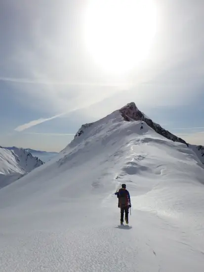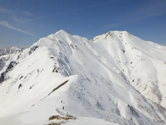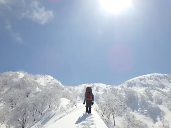 これ以上望めない最高のコンディションだ。 そしてこの先は記録が乏しい未知の世界! 緊張の面持ちで進み始めるとすぐに踏み跡を発見。極めて新しい単独行の踏み跡だ。 昨日かもしくは今日か・・おそらく平標から来たのだろう。稜線上の雪は非常にいい状態で締まっていて快適に歩くことが出来る。雪庇もそこまで発達しているようには見えない。昨年同じ時期に山スキーでこのエリアを訪れた荻原さん曰く、今年の方が雪は少ないらしい。 昨年の夏この稜線を歩いた際にはエビス大黒の頭が割と急な岩場だったので、そこでロープが必要になるかと思っていたが、しっかり締まった雪のお陰で難なくクリア。その後もロープを出す箇所もなく、急な下りはバックステップで降りれば全く問題なく、若干拍子抜けするほどコンディションが整っていた。このような状態は珍しいのかもしれない。