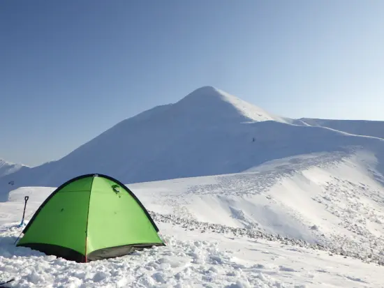 本来の計画では1,400m辺りに幕を張ろうと話していたが、結局天気が良いうちに行けるところまで進もうという判断でシッケイの頭に上がってしまった。最後の数十メートルは急登でロープを出すパーティもいるらしいが、今回は慎重にキックステップを刻み上がることができた。本来ここは風が強くあまり幕場適所ではないようだが、この日は3月の谷川では貴重な無風快晴。ここまで誰ひとりにも会わずに来た。こんな絶好の登山日和に登らないならいつ行くの?と仲間と話しながらも、この素晴らしい風景を独り占めできる贅沢を存分に噛み締めていた。 シッケイの頭は平らで風さえなければ地形図上では絶好の幕場に見えるが、整地するには風に吹かれた雪が非常に硬くスコップが入らない。ここを幕場にするのは注意が必要かもしれない。この夜は皆上機嫌でのテント宴会となり、外に出ては満点の星空と湯沢の夜景を満喫した。