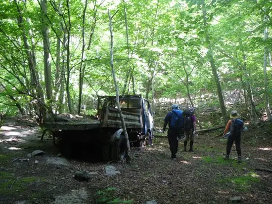 タクシーを降りてから30分ほど、さらに林道を進み2つ目の沢を横切ると目標の捨てられたトラックが目の前に現れる。ここから入渓。