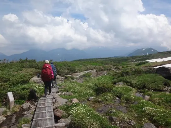 この日は五色ヶ原から薬師峠までコースタイム約12時間の長丁場。前日の様子を見ても1番心配なのは暑さ。少しでも涼しいうちに距離を稼ごうと3時起床、まだ薄暗い4時過ぎに出発する。五色ヶ原山荘を通過する頃には明るくなった。しばらくはお花畑の中に木道が続き、鳶山にゆるく登って行く。