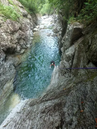 その後どの記録にも泳いで取り付くとある20mほどの淵と2条小滝が現れる。今回持参したフローティングロープは15mで若干足りないので、40mロープを繋げて古屋さんにロープを引いて先頭で泳いでもらう。彼はここを難なくクリアして側壁を上がっていく。西村さんが後に続き、最後の私は自分にロープを括り付け完全に引っ張ってもらい楽をさせてもらった。その後記録では側壁を登り懸垂で降りるとあったが、右岸をへつって滝の落ち口まで出る。最後の1mのへつりが落ちるとトイ状の滝に真っ逆さまだったので、メンバー皆若干の緊張を強いられたがここもなんとかクリア。