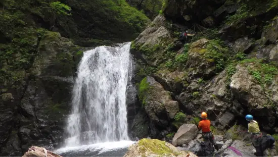 3段25mの滝ではロープを出し、古屋さんがリードで左岸を登った。セカンドで直登を試みたオオマサさんは、ぬめっている滝に苦労していた。2日目でロープを出したのはリードで1ヶ所、懸垂下降で2ヶ所だった。