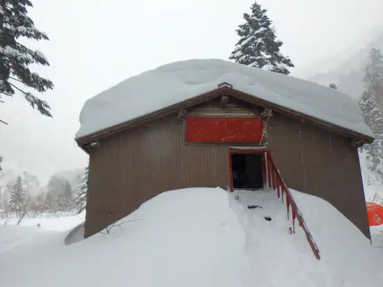 小屋でのテントは暖かく快適であった。何といっても、翌日テントを濡らさずに撤収が出来ることが大きい。