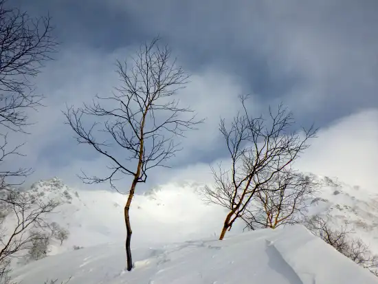 AG大学のメンバは、2,300m地点の広い所で早々にテントを張り、大阪S山岳会のメンバは行ける所まで進むとのことで7人で進んでいくが、14時過ぎに2,350m地点の適地でテントを張り出した。ここまでは曇天の吹雪ではあったが、少しずつ天候も回復してきて、たまに晴れ間も見えるようになったので、もう少しだけ進むことに。