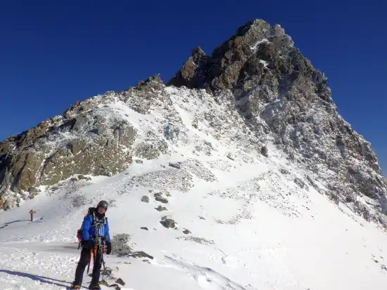 下山は事前の下見で鎖がついていることを知っていたので、鎖伝いに降りる。そうすると下から登山者が鎖を頼りに上がってくる。ここは、下山ルートであることを指摘すると、夏道は通ったことがないので知らないと言う。そのパーティに追随して2名の登山者も上がってくる。ルートが違うことを指摘して正規ルートへ戻ってもらう。再び肩の小屋に到着。1本立てて槍を見ていると沢山の登山者がいる。自分達は貸切だったためとても運が良かったと思う。