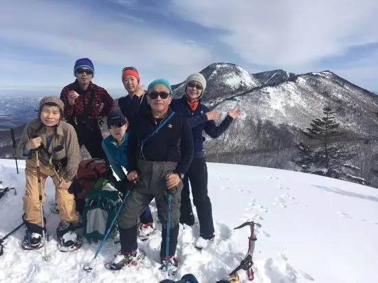 あーやってしまった!! 時間は11時。新年早々、天気も良いのに敗退なんて・・・。しかし、ありがたくも前向きなメンバー、「登れる山に登ろう!」と意見がまとまり、あと200mで山頂の佐渡山を登り切ることになった。しばらくすると後方からスキーヤーが2人追いついてきた。どうやらこの山は山スキーでは有名らしく、ツボ足で登っているのを初めて見たと言われてしまった。