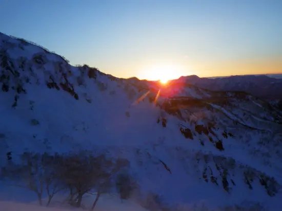尾根に取付いたところで空が白け始め朝日を望む事が出来た。