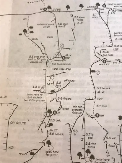 クラックがフレアしているが概ね快適。ただカムは少し決め難い。核心はフェースのトラバースで少しランナウトする。ここも30M以上あるので下降は注意。終了点は立木があるがやや頼りなく、TRをする場合はカムでの補強が必要。