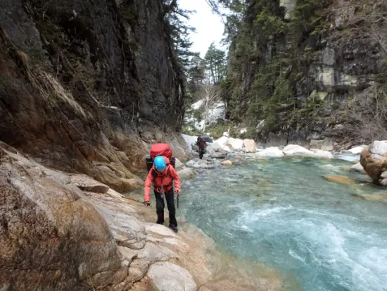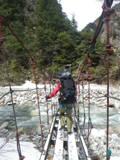 小さな発電所の脇を通り少し行くと、高瀬川は二股に分かれる。下流から見て右手が湯俣川。左手がこれから進む水俣川。吊橋を渡って少し行くと、さっそく1回目の渡渉点だ。見た目はそうでもなかったが入ってみると水深は太腿くらいまであり、かなりの水圧だった。途中で拾った木の棒とストックを両手に持ち、水流に負けないよう体を支えて歩く。雪解けの冷たい水が肌を刺す。ひやあっ、冷たい!いや、冷たいのを通り越して痛い!