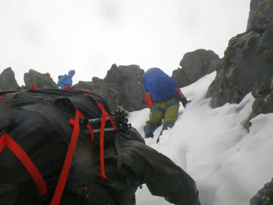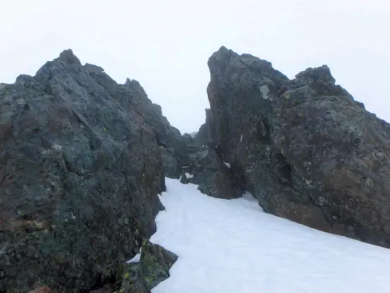 夜半から時折強く雪と風がテントを叩いていた。ひとまず2時半に起床し朝食をとるが、天候は回復する様子もなく、この天気で行動しようとは思えなかった。昼前には天候もある程度回復しそうなので、11時出発予定とし、再度シュラフに入る。明日の天候も悪いため、一日停滞はできれば避けたい。よほどの悪天でもない限り、独標だけでも今日のうちに越えようと思っていた。9時過ぎに目を覚まし準備していると、天候も回復してきたようで、出発する頃にはみぞれまじりの雨も小康状態となっていた。1時間程で核心の独標基部に着く。1ピッチ目は左のルンゼを登るが上部はかなり立っていて雪も不安定だ。右側のハイマツでランナーをとり、上に乗っ越すように上がる。2ピッチ目はリッジ状を上の雪田まで。途中、独標のトラバース道が大きな音を立て雪崩れているのが見えた。言うまでもないがトラバースする場合は細心の注意が必要だろう。その後はザイルを畳み独標頂上へ。晴天なら正面に槍ヶ岳が見え絶景が望めるようだが、ガスの中で展望はなく、視界は次のピークがやっと見える程度だ。