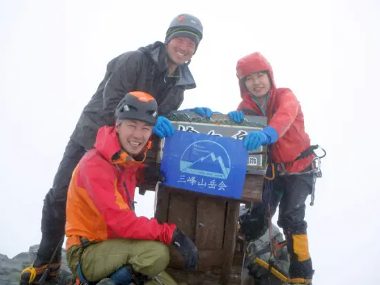 「山頂直下は天候が悪いと何処に居るのか分からず気付くと山頂に到着」なんてネット記事をよく下調べで見ていたが正にその通り。更に傾斜が増し雪質もアラレ状のザレザレの崩れ雪の状態に変わり必死に登っていくが気付けば直ぐ上に人影があるではないか!そうそこはこの4日間殆ど人とも会わずノートレースの道を進んで来た我々のパーティーの憧れの終着点であった。しばし感傷に浸りメンバー全員で握手を交わし記念撮影など。偶然居合わせた気さくな方に写真撮影をお願いした。予期せぬ行程になり「令和元年5月1日 北鎌尾根~槍ヶ岳 初登頂」をGET。何とも良い気分ではないか。
