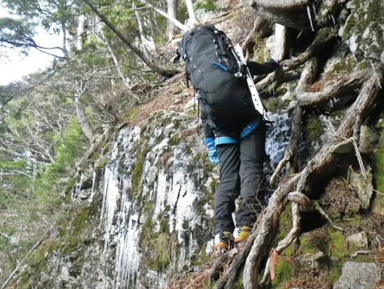 P2基部からは所々木の根を掴んでの急登となる。P2肩に乗ると一旦傾斜は緩み、いよいよ北鎌尾根に合流する。この辺りから雪はだいぶ増え、アップダウンも多く時間がかかる。