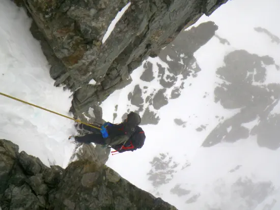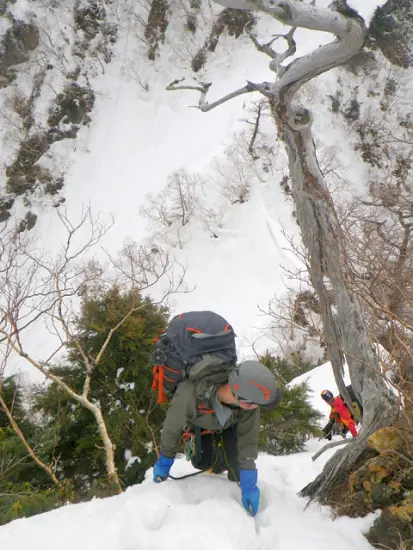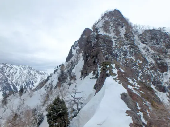 P5は天上沢側から巻くが、岩が露出しており、ところどころシュルンドが口を開け雪は不安定そうだ。懸垂用の残置があったが、ロープを出す程でもなさそうなので6m程クライムダウンした後大きくトラバースするが、雪はグズグズで気持ちのいいものではなかった。ルンゼ状の急登を登り、トラバース気味にP5-P6のコルに上がる。束の間今度はP6を千丈沢側のルンゼから巻くように登るが、氷結している箇所があり若干気を使う。