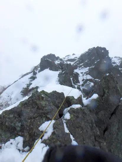 結構な斜度なのでWアックスで登攀する。夏は色々と登られているのであろうか、どこが正解ルートという事はなくあちらこちらの岩に残置ハーケンが見える。この日、岩と岩の隙間ルートの通過に一箇所ザイルを出した。トップのリーダーは軽々登っていったが自分は良い手が見つからず時間を結構費やしてしまった。そのまま結構な斜度の斜面をWアックスで登っていく。