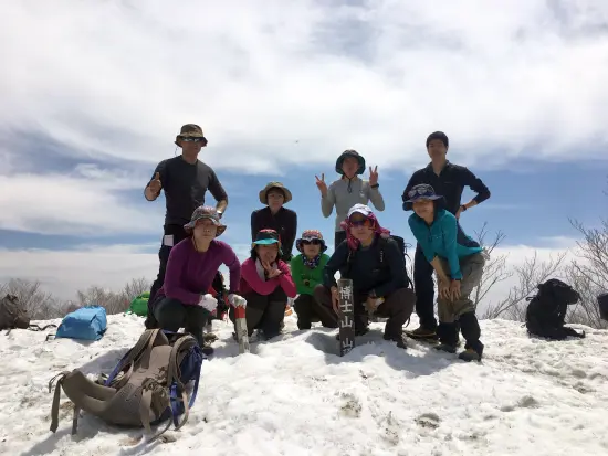 寝不足のまま6時に起床し6時半にまるみ荘を出た。博士山登山口までの約1時間半の道を車2台総勢10名で行く。当初登山口がわからず右往左往した。看板はちょこちょこ出ているが、お喋りに花が咲くと見落としがち。目指す道海泣き登山口の駐車場は不動沢林道のT字路まで行き左折して700メートル程のところにあった。道路左に車が7,8台駐車できるスペースがあり、その奥に繋がった道を下ると100台は駐車できそうな広場がある。ここで支度を整え8時半頃出発。最初の20分程は平な湿地帯を歩いていく。水場のサインが出たあたりから、道海泣き尾根に入り後はひたすら急登の連続。道海が何だかは知らないが、泣き尾根なのは身をもって体感した。今回参考にしたどの記録もこの時計周りの周遊コースで反時計回りはなかったが、歩いてみて納得。とてもこの急坂を降りたいとは思わない。辺りは新緑のブナ林で身体はシンドイが目にはやさしい光が入ってくる。ブナにまじってタムシバが咲き乱れていた。後で知ったのだが、タムシバは冬眠から覚めた熊ちゃんの大好物らしい。ぞぞ~。そういえば途中でっかい熊のう○こがあったっけ。足元にはびっしりとショウジョウバカマやイワナシが咲き乱れ、初夏の山を堪能する。頂上直下はまだ雪に覆われていて、頂上の山名板も下半分は雪に埋まっていた。ゴゼンタチバナの葉はいたるところにあるのに花はまだ出ていない。道理でユキザサもないわけだ。この日は暑かったので、雪の上を歩くのが涼しくて気持ちいい。軽アイゼンは持参したが、雪は強い日差しで柔らかくなっていて結局最後まで使わなかった。