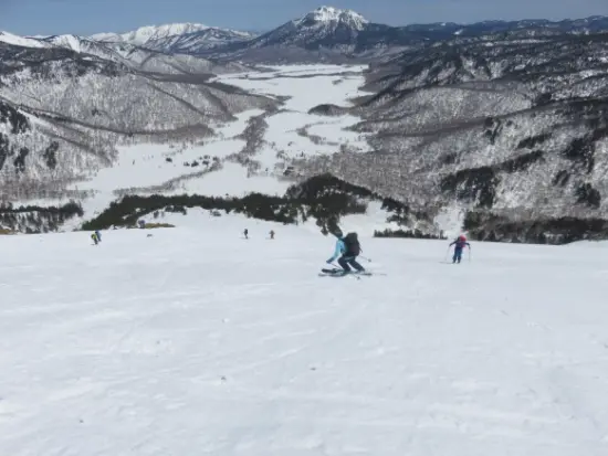 山頂でひとしきり記念撮影したり遊んだりした後、いよいよ本番!今回は山の鼻へ向け尾根周辺を滑走する。燧ヶ岳と尾瀬ヶ原を目前に眺める広い斜面。雪質も丁度良くザラメがかっており、どこを滑っても気持ち良く、心から楽しめる!清水さんから「こういう雪、クリームブリュレっていうんだよ~」と聞いた。確かに表面がちょっと固まっていて中がふわふわで、美味しそうだ。