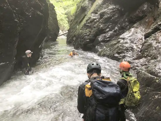 そうこうしているうちに正午を回り、12:30に第1ゴルジュに到着。リーダーが泳いで突破し、メンバーは順番にロープ伝いで泳いだり、ロープで引かれたりして越えた。メンバー全員越えるのに30分以上かかった。