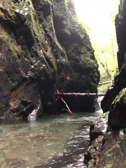 第2ゴルジュに到着したのは14:30頃。薄暗いゴルジュには倒木が一本横たわっており、その先左側には勢い良く白泡を立てる小滝が見える。他の遡行記録から、第2ゴルジュの後半は水勢が強いことを予め知ってはいたが、これが手強かった。まずは小芝さんがロープを繋ぎ泳いで、突破を試みる。数回チャレンジしたが、倒木の先で水勢に押し戻され進めない。その後リーダーがトライするも、敢え無く戻ってきた。この時点で1時間ほど経過しており、じっと見守るだけの私たちは、第1ゴルジュで全身濡れていた寒さからガクガク震えて待つ。最後に真打ち・永岡さんが、「俺が行ってもダメならダメだろう」と立ち上がり、華麗にクロールで突破を試みる。が、やはり圧倒的な水流に押し戻され、こりゃだめだと戻ってきた。