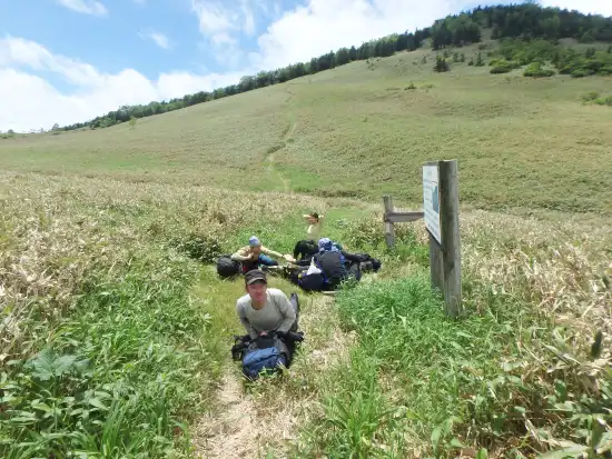稜線まで上がり沢装備を解き、あとは4時間程、野反湖を目指し稜線を辿ればよい。天気は回復基調で雨も止み空が明るくなってきた。カモシカ平に着くころには青空ものぞかせ、すっかり夏の縦走のような雰囲気になっていた。