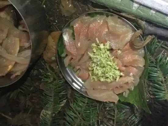 今回、マイタケは採れなかったが、ヒラタケとムキタケが採れた。イワナは9匹。途中天然ワサビもGETし、刺身、なめろう、天ぷら、きのこ汁と豪華な宴が催された。